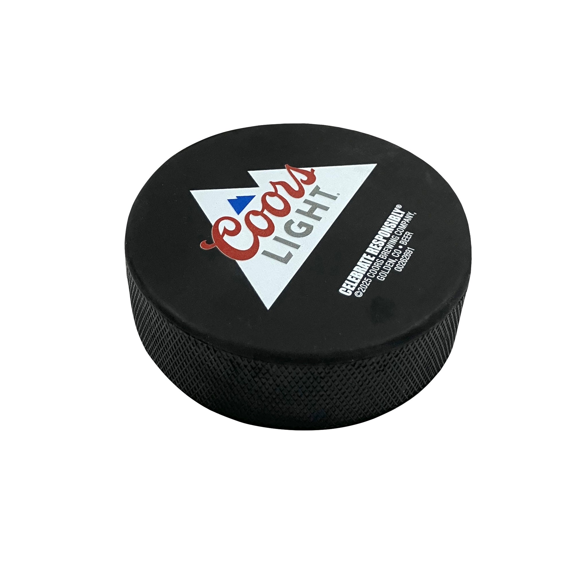 A multi-purpose puck! Rubber hockey puck has a bottle opener on the bottom to crack open an ice-cold Coors Light.