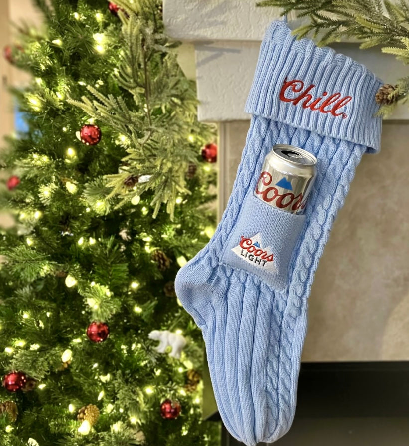 This stocking is for the grown-ups! A knit pocket that fits a can highlights this 20" holiday stocking. Includes strap for hanging up.